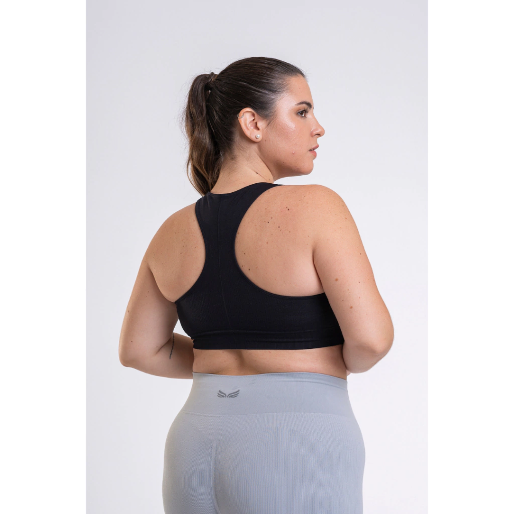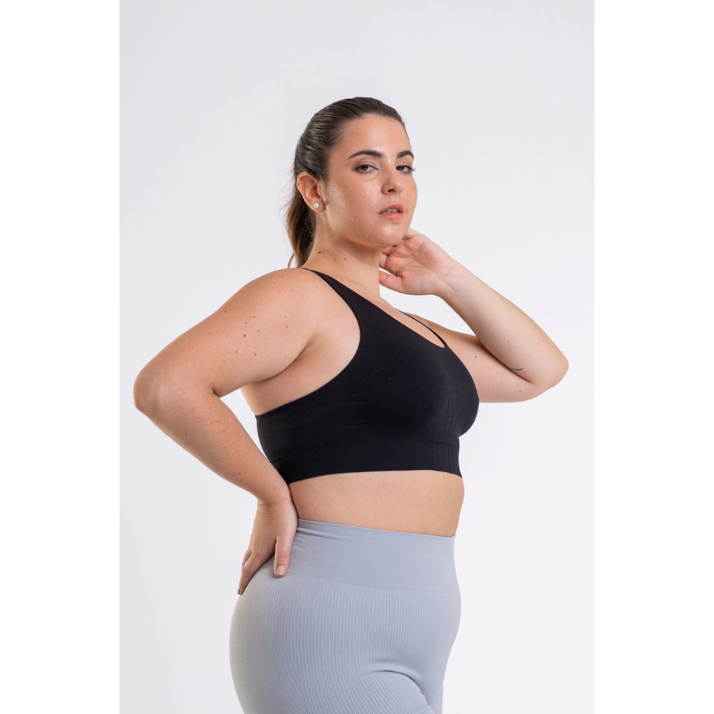 Sin costuras con espalda deportiva y breteles regulables al tono.