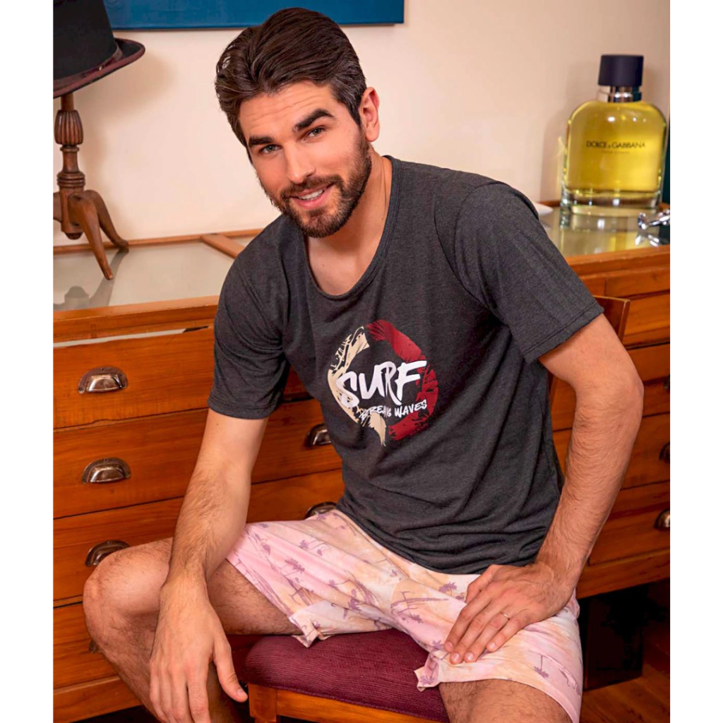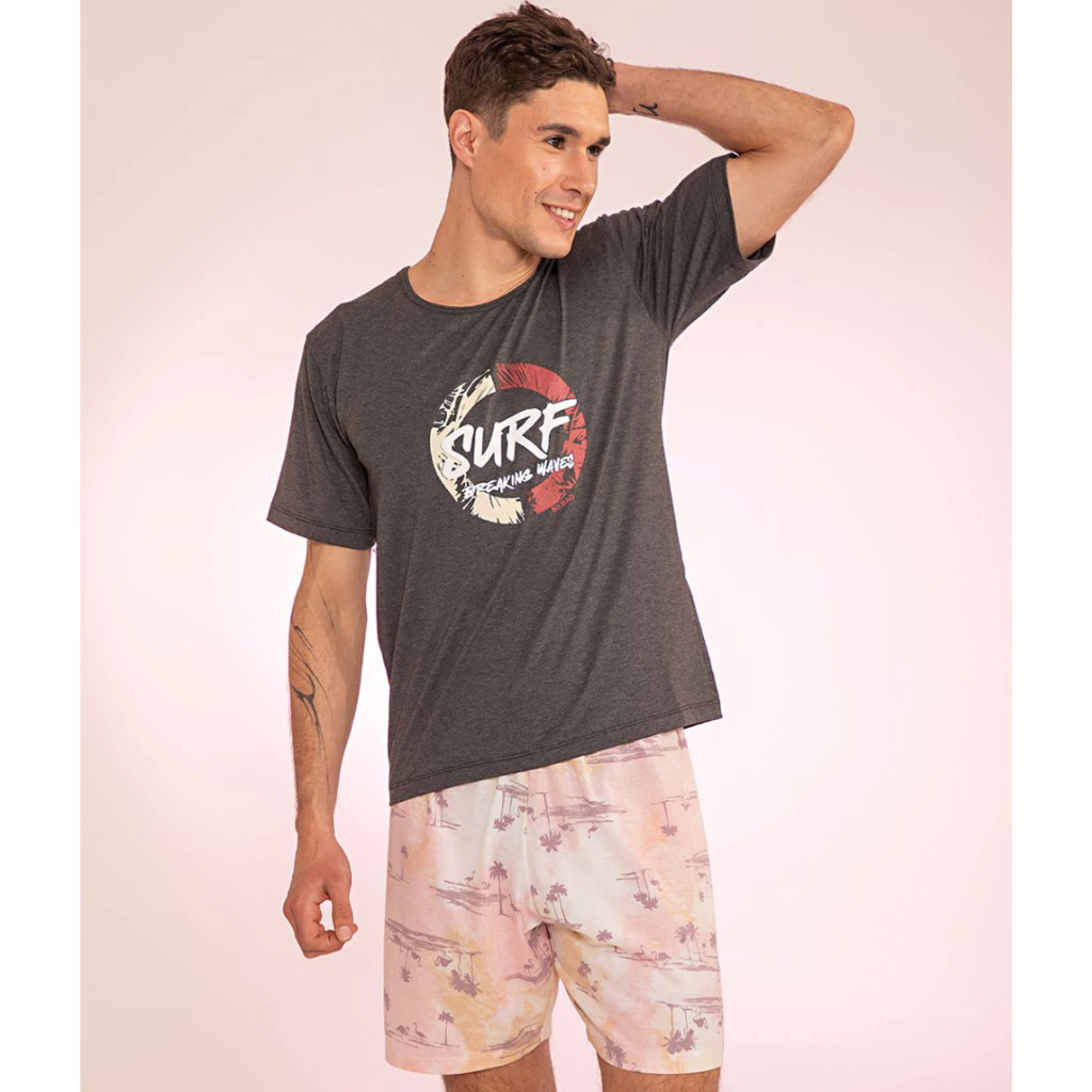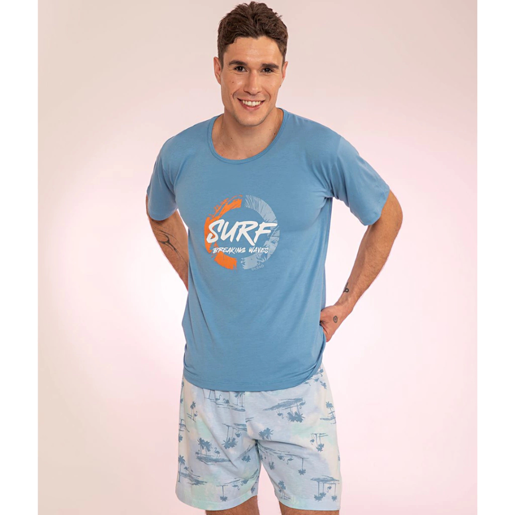 *Pijama Hombre Verano Modal, Remera Con Estampa Central *Surf* . Short Estampado.