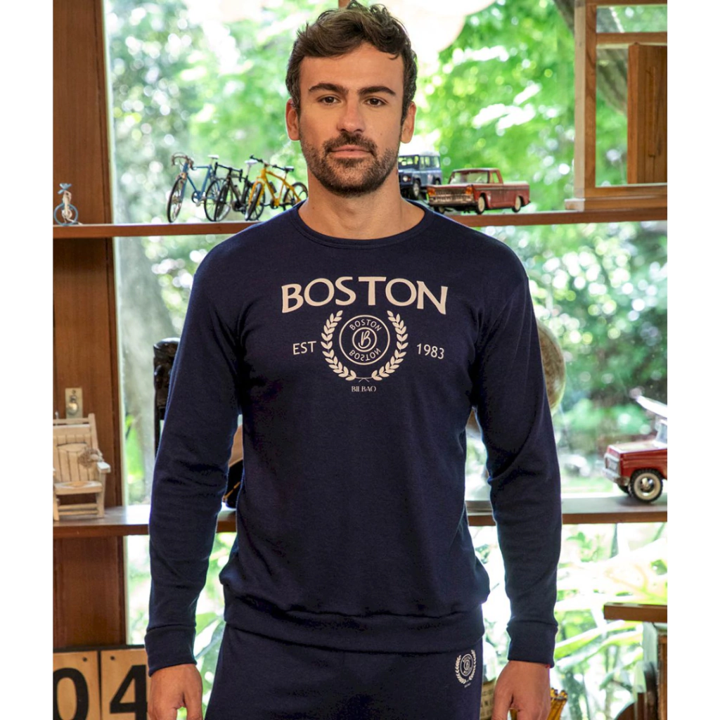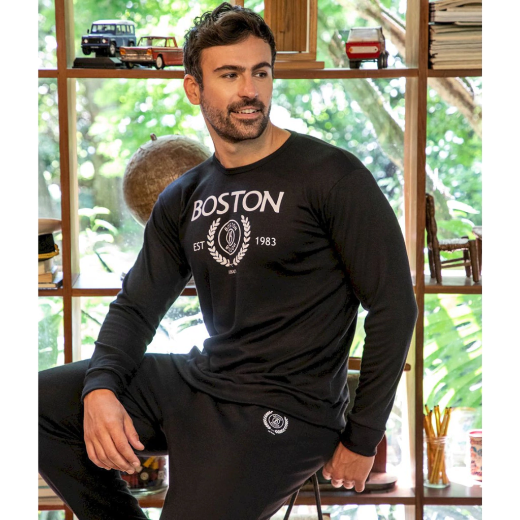 Pijama de hombre en Interlock. Casaca manga larga con puños, cuello redondo, con estampa al centro. Pantalón largo con puños en botamangas.