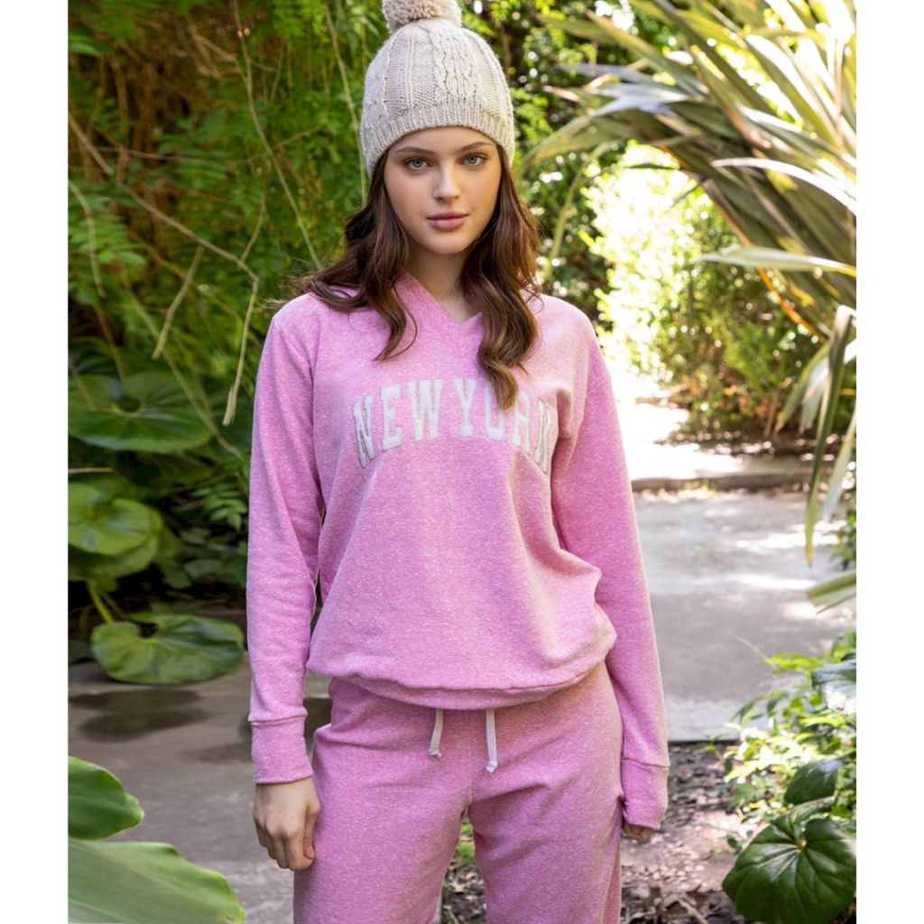 Pijama en Algodón Frizado. Remera manga largan con puño y cintura. Con bordado al centro. Cuello en V. Pantalón largo con elástico y lazo decorativo en cintura. Puño en botamanga.