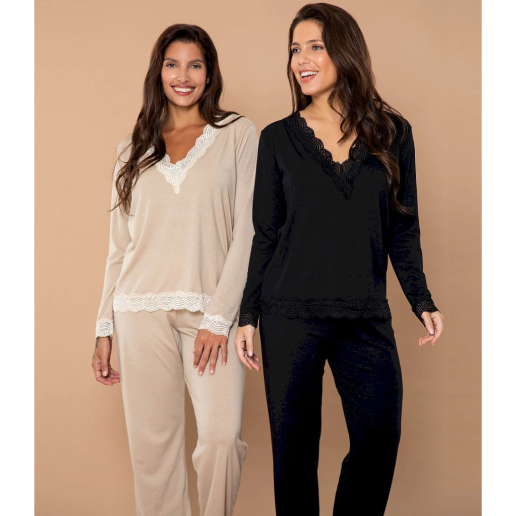 Pijama en Modal. Detalles en Puntilla. Remera manga largo. puños y escote con detalles de Puntilla. Pantalón largo recto con elástico en cintura.